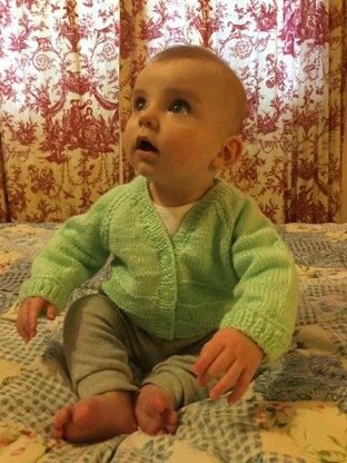 This little cardigan is knitted in one size and can be worn by a baby boy or girl.