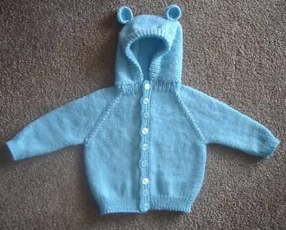 An easy knit from the top down pattern. The hood is easy to knit too, with cutest ever teddy ears! Knit one up for the upcoming baby in any color you wish. This is an easy pattern, even though you may not think so. Use 10 ounces sport weight yarn, knitting needles US # 4, and # 6. Work goes quickly on this. You can knit up several to expand baby's wardrobe. Fits 6 to 9 months.