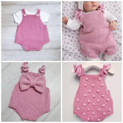 This cute DK-weight romper is designed with both style and practicality in mind. It is knitted flat in two pieces—front and back—with the main body worked in smooth stocking stitch and a contrasting 4 st moss stitch border along each side. The back features a structured bib panel worked in moss stitch, which leads into the dungaree-style straps that fasten at the front with buttons, allowing for an adjustable fit as baby grows.
