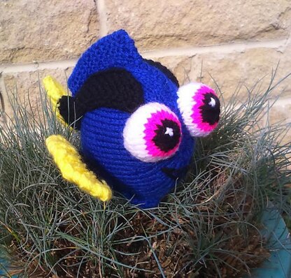 Baby Dory is knitted flat and requires seaming, the body and the eyes are stuffed. The tail and fins are double thickness to give stability to the shape and a feeling of quality to the finished product.
