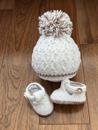 A great little set to make as a baby gift. The pattern provides the instructions to make the bobble hat and little shoes in 6 sizes Premature, Newborn, 3 Months, 6 Months, 9 Months, and 12 Months. Knitted using DK yarn and 3.25 & 4mm straight needles, so back and forth with line-by-line instructions