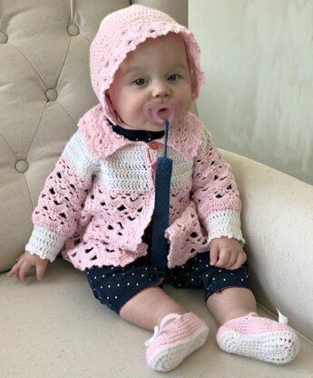 This baby girl crochet pattern features a lacey sweater with a collar and long sleeves. The file includes instructions for making a matching bonnet and Mary Jane shoes.