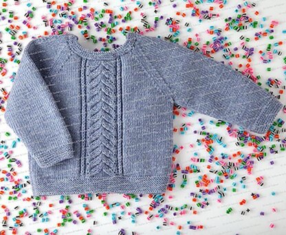 Pattern for digital download that contains all the full instructions needed to knit a lavender blue sweater for a baby of 3 to 6 months, with a pretty central panel, round neck and raglan sleeves.