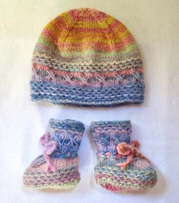 A cute hat and matching boots with a row of knitted “kisses”, in soft, slow striping DK / 8 ply singles yarn or a plain colour if you wish. Plied yarns can also be used but the yardage and sizing may differ.