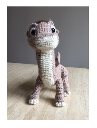 Cute crocheted baby longneck dinosaur plushie with safety eyes. (popularized by Littlefoot of Land Before Time) Toy measures 11 inches from snout to tail and 4.5 inches wide. Black patch and humps on the back are made from felt.