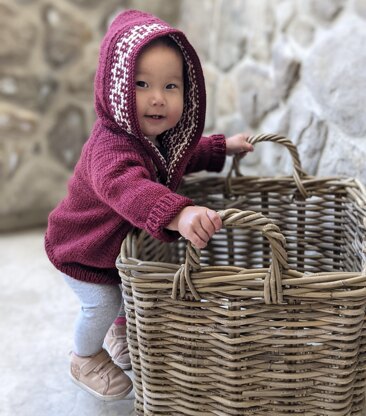 This sweater is knit from the top down with just one seam at the top of the hood. The body is worked flat; the sleeves are worked in the round. Stitches are picked up along each side edge and around the hood to work the mosaic button band. The mosaic band is created by using the mosaic technique, which means you only use one color per row and slip the other. Stitches are slipped with yarn in the back on RS rows, and on WS rows, the stitches are slipped with the yarn in front.