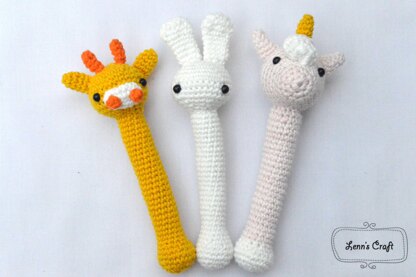 The size of finished doll is approximately 14 cm tall from bottom to head not include ears. Diameter rattle 1.5 cm- 2 cm if you use same crochet and yarn.