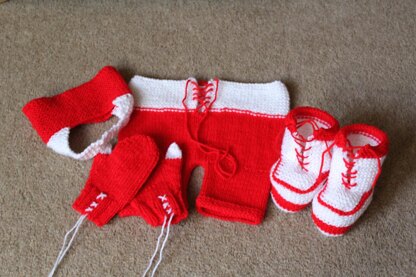 I designed this set for my step-grandson to wear in his first ever professional photo shoot. His mum wanted something cute and memorable. The outfit is designed to look like a boxer's, with long shorts, boots, a head protector and boxing gloves. There is an added lace up detail as would be seen on a vintage style boxer's kit.