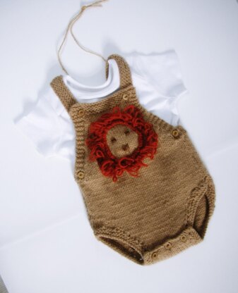 This cute, DK weight romper has a fun loopy lion mane added to the front section. The romper is worked mostly in stocking stitch with a garter stitch hem and a 4 stitch border at each side. The back has a G St waistband that extends round to the front to fasten with buttons on each side and straps fasten on the bib top. The mane is created using loop stitch, if you prefer the mane may be worked as a fringe.