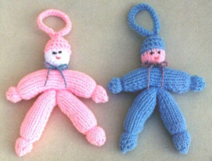 Easy to knit, use up scrap yarns. Size is almost 8 inches tall. Materials: Thick worsted weight yarn, about 1½ oz. (75 yds) any color for suit and hat, plus small amount of white, tan, pink, or brown, or any color for face. Yarn for embroidering face. 1 pr. (U.S.) # 7 needles, plus small amount of pillow or toy stuffing.