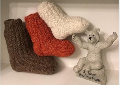 Knitting pattern for a cute little baby sock and mitten set. The lovely natural yarn used is not only cosy but very stretchy too. It would make a lovely set to welcome a new baby to the world! The largest size of mitten has thumbs.