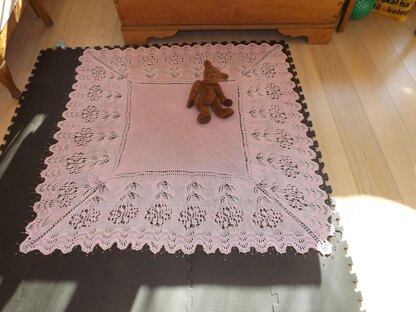 The Baby Summer Blanket is a baby Blanket has a garter stitch middel, a lace pattern and a lace edge. The blanket is knitted in one piece starting at the middle of the blanket.