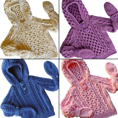 Everyone loves a hoodie, and this pattern is both practical and stunning. The hood hugs the face, the cables produce an extra layer of warmth, and optional fingerless mittens can button to the cuffs. Sizes range from Baby to Toddler, but the various sizes are achieved by type of yarn and gauge, not by number of stitches. A lightweight yarn (6.5 sts = 4") will make a sweater for a baby while a worsted weight (4.5 sts = 1") will produce a sweater for a toddler. Yarn requirements for various sizes are provided in the pattern.