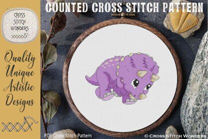 An adorable Baby Triceratops Design.\nOriginal licensed artwork by Clipartopolis.\nCross Stitch Pattern designed by Marcia Manning.\n80 stitches wide by 56 stitches high.\nPDF is a COLOR counted cross stitch chart which lists suggested DMC floss colors, and includes a color picture.\nStitched design size is as follows:\nSize 11 count: 7.27 x 5.09 inches or 18.47 x 12.93 cm\nSize 14 count: 5.71 x 4.00 inches or 14.51 x 10.16 cm\nSize 16 count: 5.00 x 3.50 inches or 12.70 x 8.89 cm\nSize 18 count: 4.44 x 3.11 inches or 11.29 x 7.90 cm\nSize 22 count: 3.64 x 2.55 inches or 9.24 x 6.47 cm
