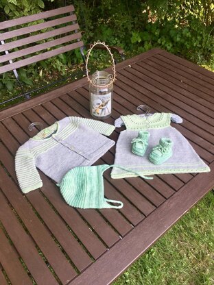 Material: 150g Lana Cotton 212 von Hjertegarn A/S Beispiel: Farbe Rock 434 Hellgrau Farbe Passe 7093 Hellgrün 1 Rundnadel 2,5 und 3 mm 2 Maschenmarkierer 2 Knöpfe 1 cm Durchmesser