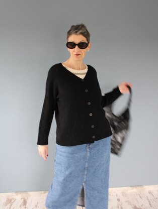 is a top down Raglan cardigan with v-neck and long sleeves.