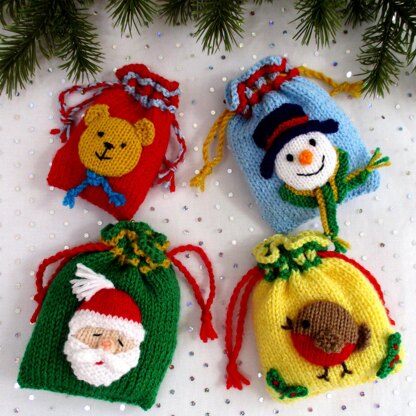 If you have a stash of coloured yarn to utilise, you will love making these brightly coloured drawstring bags. They are fun to design and quick to knit. Ideal for hanging on the Christmas tree, gifts at children’s parties and very popular at craft fairs and bazaars. Santa, the snowman, robin and teddy bear are all knitted separately and stitched to a bag of your choice. There are 3 sizes of bag for you to knit.