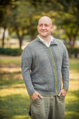 Top-down saddle-shoulder construction and a zipper that slants across the front make interesting knitting, while the lightweight, recycled-fiber yarn suits men’s higher body temperatures. Apart from the top part of the yoke, which requires close attention, the rest of the sweater is easy, quick knitting and requires no seaming.