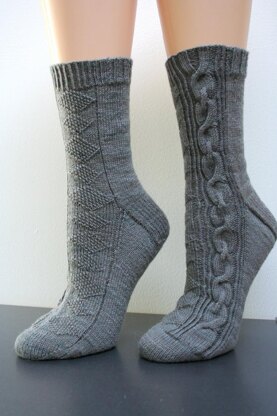 The Bailiwick socks use cable and diamond patterns, which are commonly used in Guernsey (Gansey) sweaters. A bailiwick is an area that is overseen by a bailiff -- Guernsey is one of two bailiwicks in the Channel Islands. These socks would be suitable for either a man or a woman, and knit up quickly. The socks are designed to be asymmetric, with the pattern down the leg mirrored from the right sock to the left.