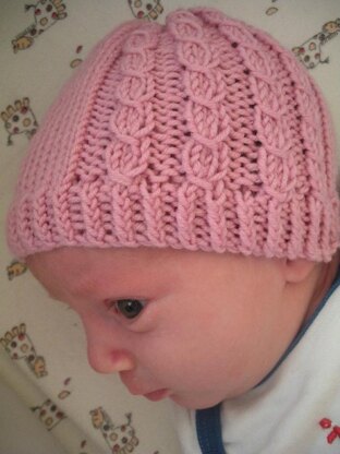 This beanie is worked from the brim to crown in the round. The brim can be worked in simple garter stitch or twisted rib, and the body features a panel of mock cables.