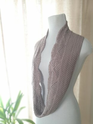 The Ballroom is a simple circular cowl with a beautiful lace edge on the other long side. The cowl is worked in rounds. The lace pattern resembles ballroom chandeliers. The rest of the cowl is worked with three-row seed stitches. The piece is to be worn wrapped twice around the neck.