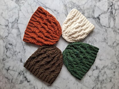 The hat is sized for an adult, with 4 different sizes included, but instructions are given on adjusting the stitch count to create a smaller or larger hat. Any Aran or worsted weight yarn should be suitable for this pattern. One 100g skein should be just enough for one hat.