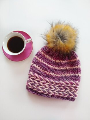 The Banded Braids Beanie has three eye-catching Latvian braids on the brim of the hat and the body of the hat has three simple stripes. The braided brim makes the hat super warm and comfy!