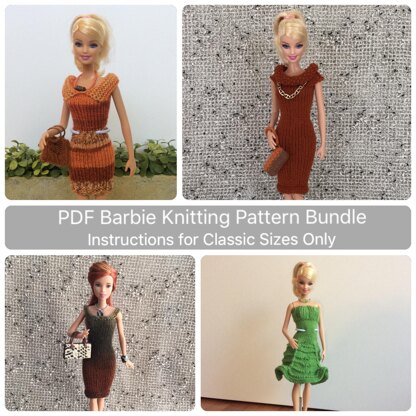 This knitting pattern bundle includes: - Slip Dress with instructions for Classic Barbie Sizes/Body Types - Sundress with instructions for Classic Barbie Sizes/Body Types - Scoop Neck Dress with instructions for Classic Barbie Sizes/Body Types - Sweater Dress with instructions for Classic Barbie Sizes/Body Types
