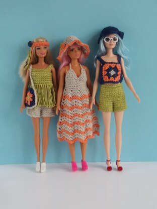 The 70's fashion is back with fringes, granny squares and floppy hats, great for Barbie and friends to wear at festivals. This set includes, dress, hat, fringed top, shorts, granny square top and bag. Some items are made in continuous rounds and others in rows. Note where the pattern says to work through back or front loops. The shorts have 2 sizes, one for regular Barbie and the larger size for Curvy Barbie. Made in 4ply yarn the items use only small amounts: 25g for the dress and 10g or less for the other items . Please note :The pattern is free on my blog Linmaryknits but the benefit of a PDF is it can be printed out and is add free.