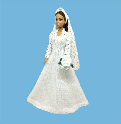 Here is a knitting pattern for a Kate Middleton style wedding dress with veil and bouquet to fit Barbie / 12" fashion doll. There are no fasteners so the outfit is child safe. USES 3.25mm STRAIGHT NEEDLES AND DK YARN. The dress takes around 48g of white DK, the veil around 14g.