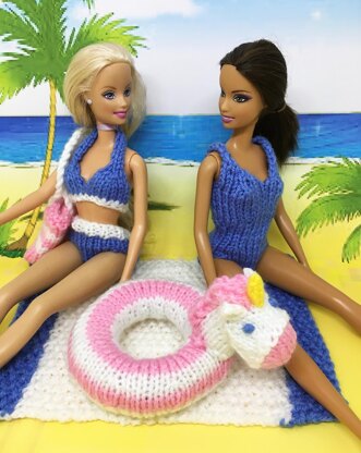 The pattern includes a bikini, swimming costume, towel, beach bag and a unicorn rubber ring (can be knit as a plain ring without the unicorn attachment). All knit with DK yarn using 2.75mm straight needles (3.75mm for the towel). No button or fasteners so is child safe.