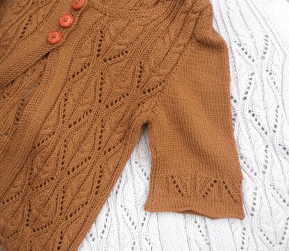 Soft luxurious cardigan with lace detail panels to both front and back with a little shaping at the waist. Worked on straight needles, sleeves are worked from the sleeve caps down and a 1 row buttonhole technique makes this an extra ‘special knit’.