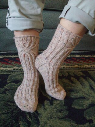 The socks are knit from cuff to toe with a basket weave cable inset and a braided pattern that is easily remembered. As you knit them may you enjoy some pleasant memories of travels in our countryside.