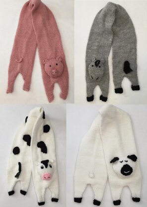 Fun to knit, and this will be a hit! All the children will want one! Let them pick out their own favorite animals. Chose from cow, pig, sheep, horse. Easy directions, started at bottom legs, ending at front legs. Then add head and features. Teenagers also love this scarf! Make the body longer though, before adding the head! Uses worsted weight yarns, knitting needles US # 9. Finished length for children's size is about 35 inches long. If teens and ladies want this, you can make body longer! This is easier than it looks!