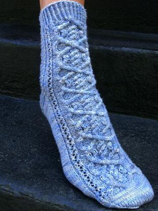 The sample shown was knit in Three Irish Girls Beckon Merino, shade Storm Cloud.