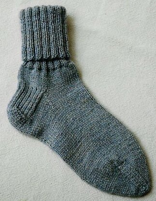 This sock pattern, worked in the round from the top down, includes eight sizes and instructions for the Double Cast-On (Long Tail), the Dutch heel, the Wide Toe, and Kitchener Stitch. Photos and explanations are included for the techniques.