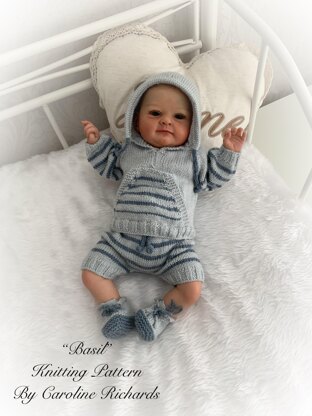 No additional buttons, ribbon or lace needed for this one, just yarn, and needles. The pattern includes the instructions to make the hooded tracksuit top, shorts and trainers. Sizes for a 0-3 month old baby or a 16-22” Reborn doll. Knitted from the top-down, I don’t use or really like circular needles so with this and all my designs it is made using single-pointed standard needles. The pattern has line by line instructions, making it easy to follow.