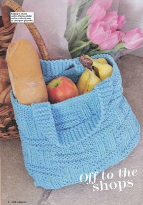This is a pattern for a Basket Stitch Shopper, originally published in Knit Today. It is in a simple knit and purl basket pattern fine for beginners, with garter stitch top border and handles. It is knitted in one piece, using the yarn doubled. The bag can be lined for extra durability. Photo Knit Today.