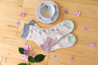 Bavaria Leaves is a cuff down sock decorated along the side with little leaves. These leaves are reminiscent of the leaves on my grandmother’s teacup, which is what inspired this sock design. The three contrast colors for the leaves are then used for the cuffs, heels and toes - giving these socks a scrappy sock feel, which further reminds me of my grandmother who endlessly patched her clothes and never let anything go to waste.