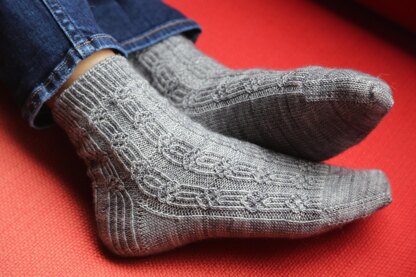 The Japanese Knitting Stitch Bible is my new favorite knitting book. You might recognize this stitch pattern from the cover of the book. I decided to use just the one, fairly simple stitch pattern and arrange it in columns for a ribbed sock with a ‘twist’ (pun intended!). These socks are worked from the cuff down with a traditional heel-flap heel. The columns of twisted stitches flow down the heel, and the stitch pattern continues down the instep of the foot.