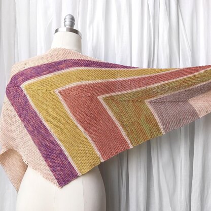 A striking shawl with vintage appeal, this design perfectly pairs a full 100g skein of fingering weight yarn with five 20g mini skeins. You could also use two full skeins if you want all your stripes to be the same color. It's all garter stitch with some super simple short-rows thrown in to create those asymmetrical, bottom-heavy stripes.