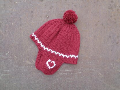 This cozy earflap hat has a sweet heart knit into the earflap, and a heart pattern around the brim. Perfect for anyone who needs a little extra love in their life!