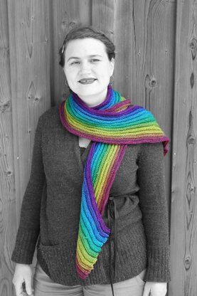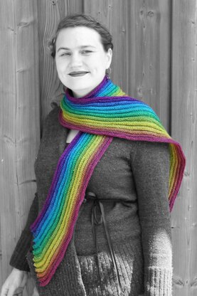 Rainbows speak of hope in the rain, of a fresh beginning after the rainstorm. I have a passion for rainbows because their colors and the meaning of love and equality. Carry your own rainbow with you in form of this scarf, knitted sideways and shaped like a rainbow with evenly spaced increases. It is designed specifically for mini skeins or stash busting. You start with a short tail cast on - the Chinese waitress with crochet hook and set markers already when casting on to simplify casting on such a large number of stitches. The scarf is constructed sideways in welts of 4 and 5 rows. Welts in one color alternate with color transition welts, where one row of the new and one of the old color alternate. The arch-shape is achieved by decreasing evenly with the start of every new color. Due to the welts, you see from one side primarily the pure colors and from the other side the color transitions.