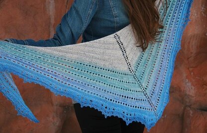The shawl has sections of garter stitch “sand bars”, as well as pretty eyelet rows to mimic the seafoam and waves along the shoreline. The final eyelet pattern is presented in both written and charted form.