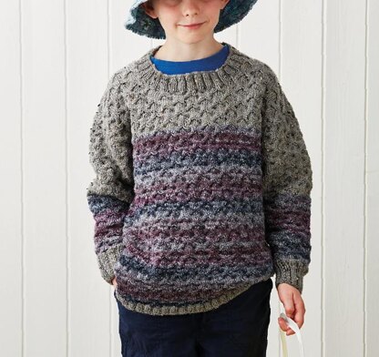 Monica Russel’s unisex jumper is packed with texture. The cable stitch pattern creates a grid with a pebbly feel thanks to the slubby yarn in the yoke and the tops of the sleeves. A variegated yarn floods the rest of the jumper with rich colour. Made with a machine-washable yarn, this jumper will see many days of exploration in nature’s playground.