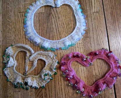 Each necklace is slightly different ... two require placing the beads (or shank buttons) as you go while the third has you pre-string the beads. Check YouTube or a knit-beading book for these techniques. Specifically: Pretty in Pink -- 40 shank buttons (faceted in jewel tones) are placed Emerald Beauty -- 34 glass beads (size 6) are pre-strung Beaded Love -- 41 shank buttons (translucent hearts) are placed