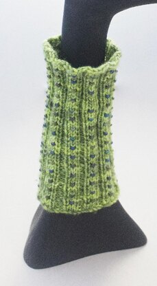 These cuffs are easy to knit and fun to wear. The pattern stitch is a simple rib pattern. The beads are inserted as you work the cuff; no need to string the beads onto the yarn before you begin. The long cuffs can be worn down on your hand or farther up your arm to keep your wrist warm with bracelet or three quarter length sleeves. The short cuffs are great fashion statements.