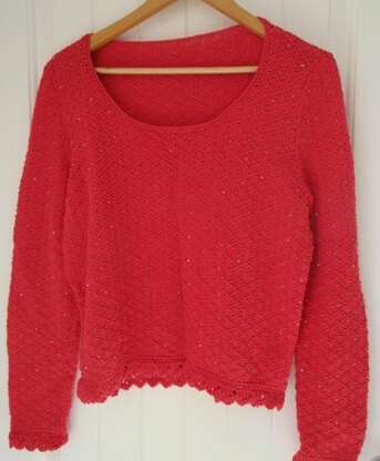 This is a pattern for a beaded lattice stitch jumper, originally published in Simply Knitting. The main part is a simple knit and purl lattice stitch, with a lace edging knitted separately. The beads can be knitted in or added when finished. Length 53-62 cm.