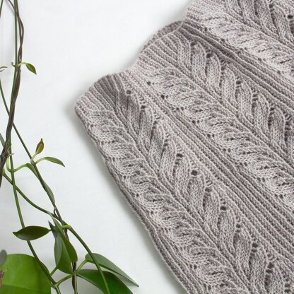 Columns of lacy leaves and half-twisted ribbing form the crisply-textured fabric of the Beanstalk Cowl, a companion design to the Beanstalk Hat and Beanstalk Shawl. The cowl is worked from the top down, and occasional increase rounds create a tapered shape which allows it to pool gracefully around the neck.