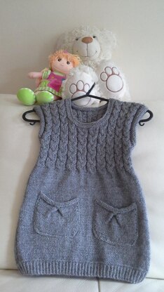 This is stylish and cozy slip-on tunic for 4 year old fashionista. It will keep your toddler warm and comfortable during cold autumn/winter days. It is made in stockinette stitch with added cables and cute pockets. The design and shape are very simple and achievable to intermediate knitter. The cables at the top make the garment naturally narrower and tighter so increases/decreases are not used to make a shape. The neutral grey of the tunic leaves a lot of space for experimenting with brighter colours in background as tops, leggins, scarves, shoes, etc.